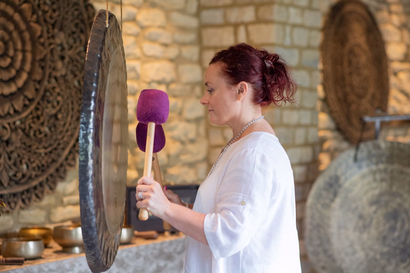 A gong bath with Kanti Freeman is a deeply immersive and therapeutic sound experience where participants simply lie down and allow the resonant sounds of gongs, singing bowls, and other therapeutic instruments to wash over them.